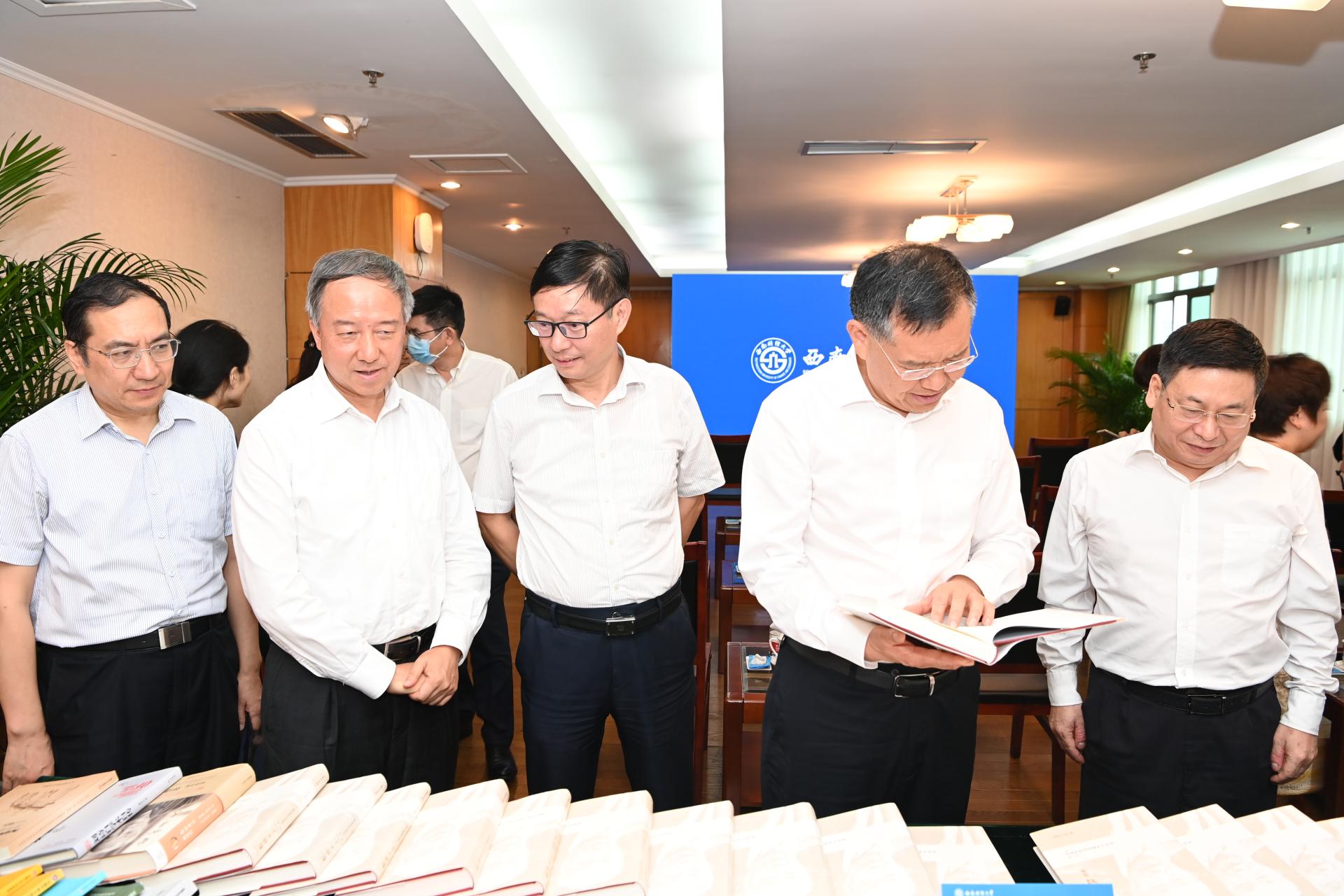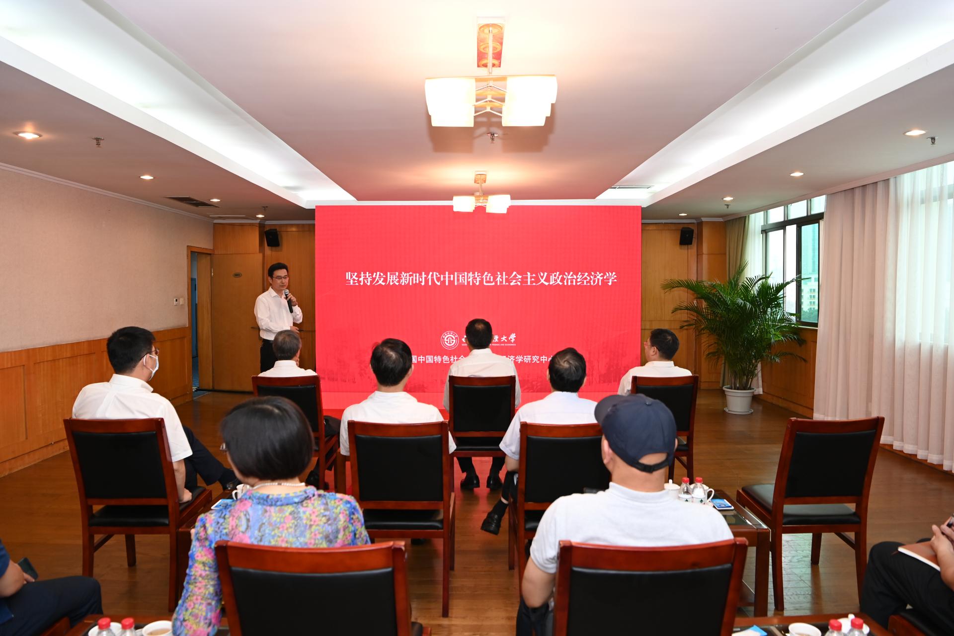 在光华楼601会议室,学校全国中国特色社会主义政治经济学研究中心负责人盖凯程教授以《坚持发展新时代中国特色社会主义政治经济学》为题,从“永利官网政治经济学学科优势长期积累的集中展现、中心学科发展规划、立足新发展阶段推动学科快速发展”三个方面汇报了近年来中心围绕“打造学术高地、筑牢思想阵地、建强育人基地”等方面的成效和特色成果。李建勤听取了情况汇报,与中心负责人进行了交流,询问了国内高校政治经济学发展建设等情况。随后,李建勤一行查看了成果展示,翻阅了中心布展的《刘诗白选集》以及政治经济学科研、教学和人才培养的标志性成果和建设情况。