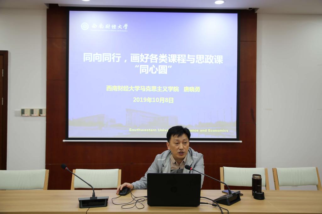 为深入贯彻全国高校思想政治工作会议精神和全国教育大会精神, 落实立德树人根本任务,2019年10月8日下午,永利yl8886官网邀请马克思主义学院院长唐晓勇教授在格致楼911会议室为全院教师作课程思政专题讲座。讲座由分党委书记兰敏主持。