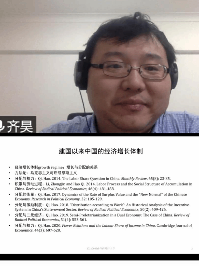 6月9日晚,中特中心纪念中国共产党建党百年经济理论与实践系列讲座第六讲在腾讯会议平台顺利举行。本次讲座由中国人民大学永利yl8886官网齐昊副教授主讲,政治经济学研究所李怡乐副教授主持。我院及兄弟院校多位教师、研究生在线聆听了本次讲座。
