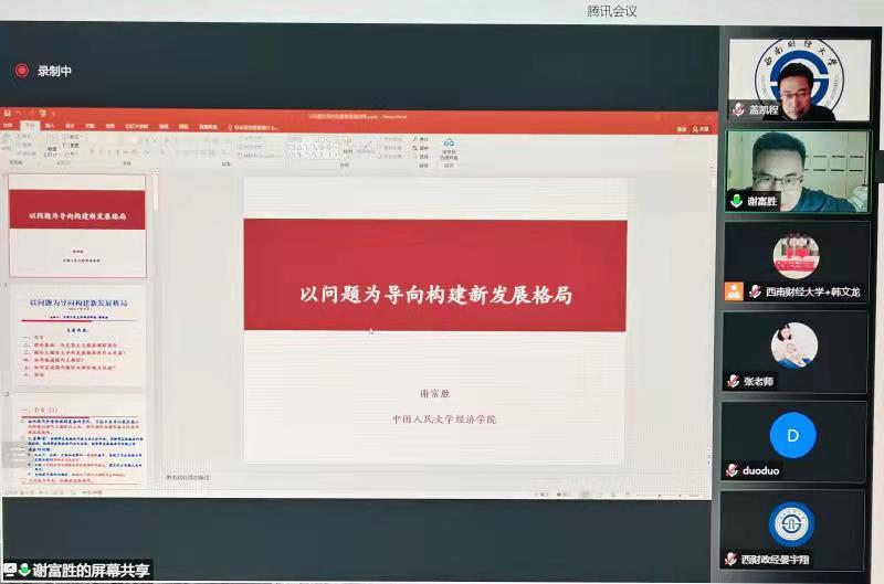 本次讲座由永利yl8886官网副院长盖凯程教授主持。国家级人才计划入选者,中国人民大学永利yl8886官网副院长、教授,博士生导师,中国人民大学全国中国特色社会主义政治经济学研究中心副主任、《政治经济学评论》副主编、中国《资本论》研究会副秘书长谢富胜教授作了主题为“以问题为导向,构建新发展格局”的在线学术讲座。永利官网经济学拨尖学生培养基地2020级全体学生等共60多名师生参加了此次讲座。