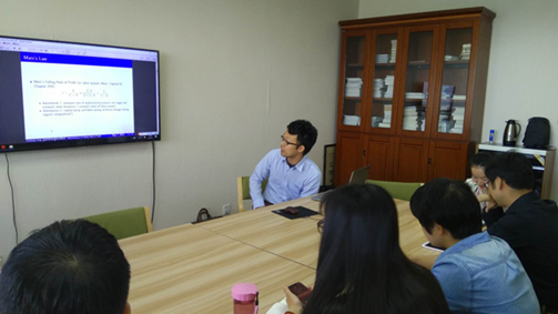 2018年5月7日上午,永利yl8886官网政治经济研究所在格致楼1014会议室成功举行。此次讲座邀请美国马萨诸塞州立大学阿默斯特分校经济系梁俊尚博士作了题为“马克思利润率下降规律的不确定性和未来研究方向”的学术报告。讲座由韩文龙副教授主持,我院吴垠教授、李怡乐副教授、李梦凡博士和我院部分学生参与了此次讲座。